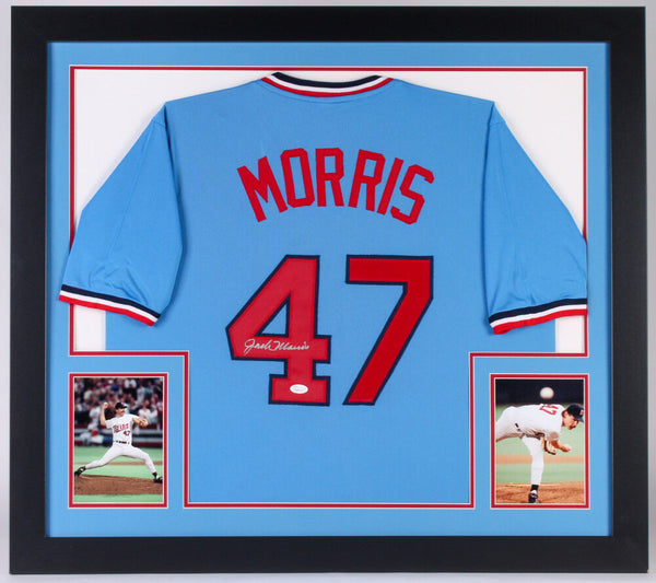 Custom frame measures approximately 31" x 35" in size and features a jersey which has been hand-signed in silver paint pen by Jack Morris (HOF). The autograph includes an official James Spence Authentication (JSA) hologram and matching COA for authenticity purposes. The signing of this item was witnessed by JSA.Authentication: JSA COA