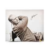 In 1962 Jack Nicklaus began his professional career and took the PGA Tour by storm quickly after. At the 1962 U.S. Open played at Oakmont, Jack defeated the heavily favored Arnold Palmer in just his 17th start to win his first professional tournament. Nicklaus won his first U.S. Open at the ripe age of 22 and his last Masters Tournament in 1986 at the age of 46. His 18 Major championships are broken down by six Masters, five PGA Championships, four U.S. Opens, and three British Opens. Here is your chance to own a piece of golf history with an autograph of the greatest golfer of all time. This limited edition (25) autographed 20 x 24 canvas print is the latest in Upper Deck Authenticated's line of Up Close & Personal pieces. The piece highlights Jack's face, showing his extreme focus accompanied by a large signature in black paint pen. His signature is deemed authentic by virtue of Upper Deck Authenticated's Five Step Process.