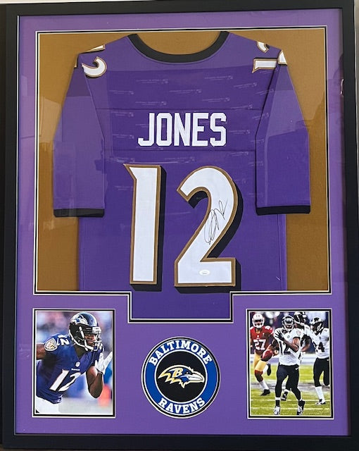 This framed jersey has been personally hand-signed by Jacoby Jones. Item is accompanied by a Certificate of Authenticity and a corresponding tamper-proof hologram or sticker on the jersey. To ensure authenticity, the hologram or COA can be reviewed online. This process helps to ensure that the product purchased is authentic and eliminates any possibility of duplication or fraud. It measures 35" x 43" and comes ready to hang in your home or office.