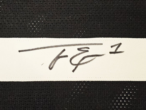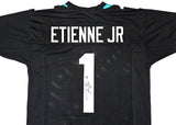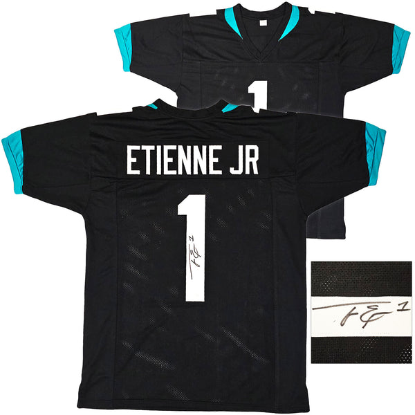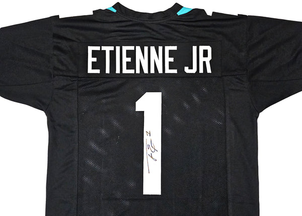 This is a Black Jersey that has been hand signed by Travis Etienne. This is a custom jersey with no name brand. The approximate size is XL. It has nice sewn in name and numbers. This item has been witnessed and certified authentic by Beckett Authentication (BAS) and comes with their tamper-proof witness sticker.
