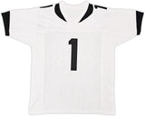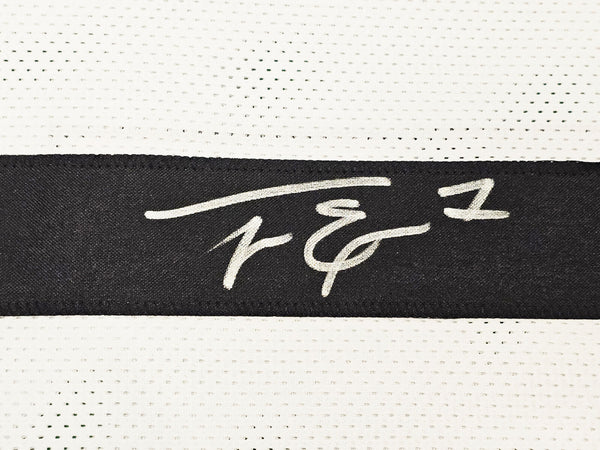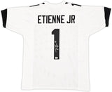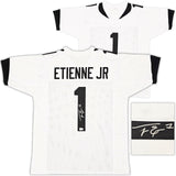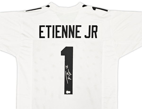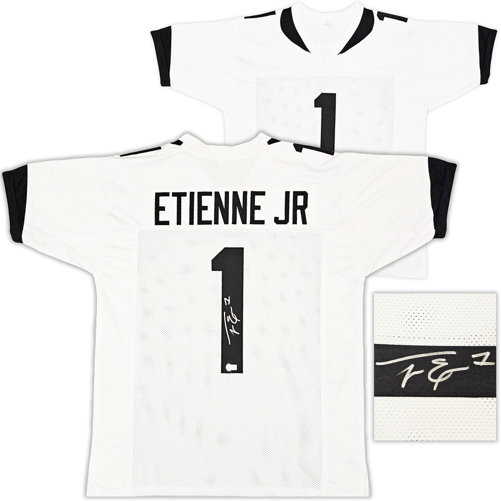 This is a White Jersey that has been hand signed by Travis Etienne. This is a custom jersey with no name brand. The approximate size is XL. It has nice sewn in name and numbers. This item has been witnessed and certified authentic by Beckett Authentication (BAS) and comes with their tamper-proof witness sticker.