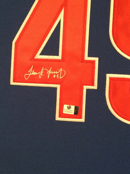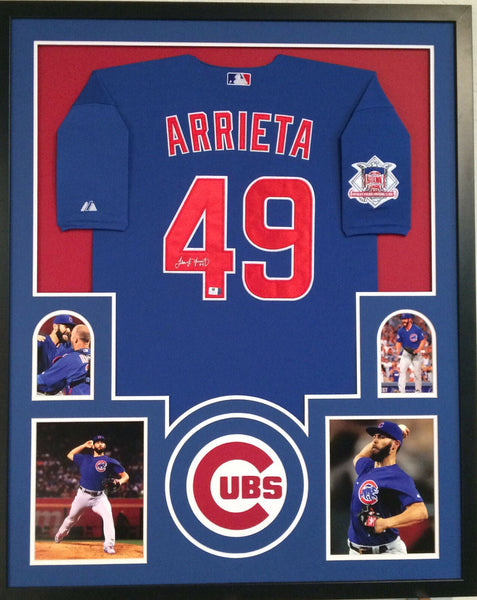 Custom frame measures approximately 35" x 43" in size and features a jersey which has been hand-signed in silver paint pen by Jake Arrieta. The autograph includes an official G.A. hologram and matching COA for authenticity purposes.Authentication: G.A. COA