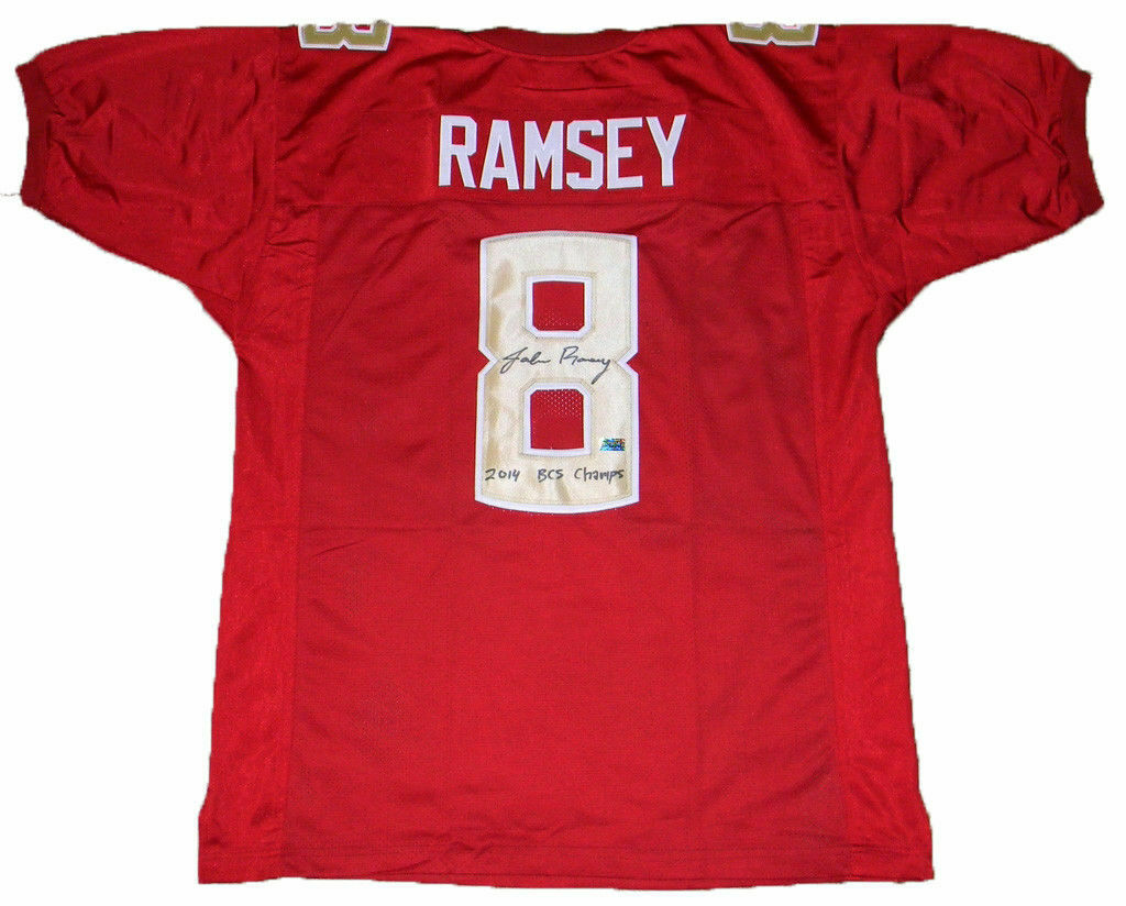 Jalen Ramsey, former All-American for the Florida State Seminoles, has hand signed this custom jersey at a private signing. He included the inscription "2014 BCS Champs". Jersey is size XL and all letters/numbers are sewn-on. This item comes with a certificate of authenticity (COA) from Signature Sports Marketing, one of the leaders in the industry. You will receive a paper COA along with matching serial-numbered holograms.Item pictured may not be the exact item you will receive. It will be similar quality, and we guarantee your satisfaction.