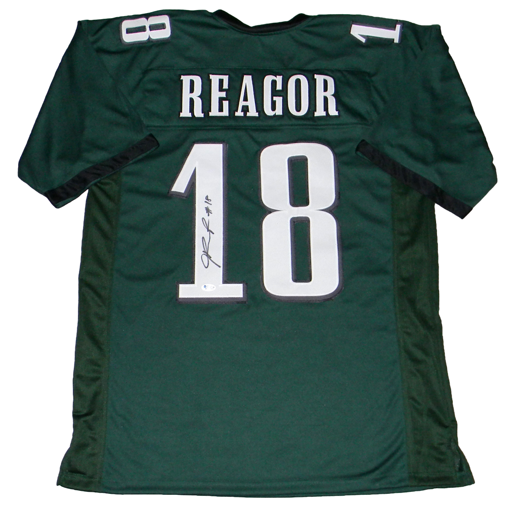 Jalen Reagor, first round draft pick for the Philadelphia Eagles, has hand signed this green custom jersey. Jersey is size XL and all letters/numbers are sewn-on. This item comes with a certificate of authenticity (COA) from Beckett Authentication Services and was signed in the presence of one of their representatives. You will receive a serial-numbered COA along with a matching serial-numbered sticker on the jersey. The authenticity can be verified online by entering the serial number.Item pictured may not be the exact item you will receive. It will be similar quality, and we guarantee your satisfaction.