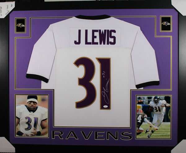 JAMAL LEWIS AUTOGRAPHED & PROFESSIONALLY FRAMED PRO-STYLE JERSEY(Occasionally our own stock pictures are used at times due to quantity of framing, all frames will look identical as the one pictured)THE FRAMED JERSEY MEASURES 35"x 44" & COMES WITH THE FOLLOWING:-UV Protected Acrylic-Triple Acid Free Team Colored Matting-2 High Quality 8"x10" Photos-Team LogoEvery framed autographed jersey is accompanied with a tamper-proof hologram on the signed part of the jersey from one of the main authenticators in the industry (JSA, Beckett, PSA, etc.) and can be verified on their corresponding websites to prove authenticity.
