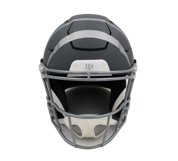 A Cincinnati Bengals Speed Flex Authentic Slate NFL Helmet hand signed by Ja'Marr Chase. The item and signature are in excellent condition. Ja'Marr is a Football wide receiver. He was selected in the 1st round of the 2021 NFL Draft by the Cincinnati Bengals. He played college football at LSU. AUTHENTICATION: The item is accompanied by a Beckett Serial Numbered and Databased Hologram