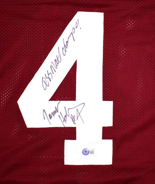 Jamelle Holieway Autographed Crimson College Style Jersey w/ Natl Champs- Beckett Hologram *Black THIS IS NOT AN NCAA JERSEY. THIS HAS NO TAGS, NO LOGOS, NO EMBLEMS. This is a hand autographed Jersey of Jamelle Holieway. This is Custom Made (non name brand) Authentic Style (stitched letters and numbers) Jersey. This item has a Beckett Authentication, which comes with a numbered hologram and a QR code for verification. You can view this item on the Beckett Authentication website, it shows when and where the item was signed. It was signed either at a public autograph appearance or a private signing. This is a stock photo of the item. Although you may not receive this exact item, the item you receive is virtually identical and brand new in great shape. Jersey size is XL.