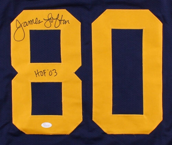 Custom on-field style jersey. Everything is sewn on, size XL. Hand-signed in black felt-tip pen by James Lofton (Green Bay Packers, Buffalo Bills, Oakland Raiders HOF). The autograph includes an official James Spence Authentication (JSA) hologram and matching COA for authenticity purposes. The signing of this item was witnessed by JSA.Authentication: JSA COA