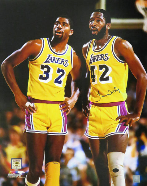 James Worthy signed Los Angeles Lakers standing with Magic Johnson 16x20 photo. Item comes with a Schwartz Sports Memorabilia tamper-proof numbered hologram and Certificate of Authenticity which can be verified online.