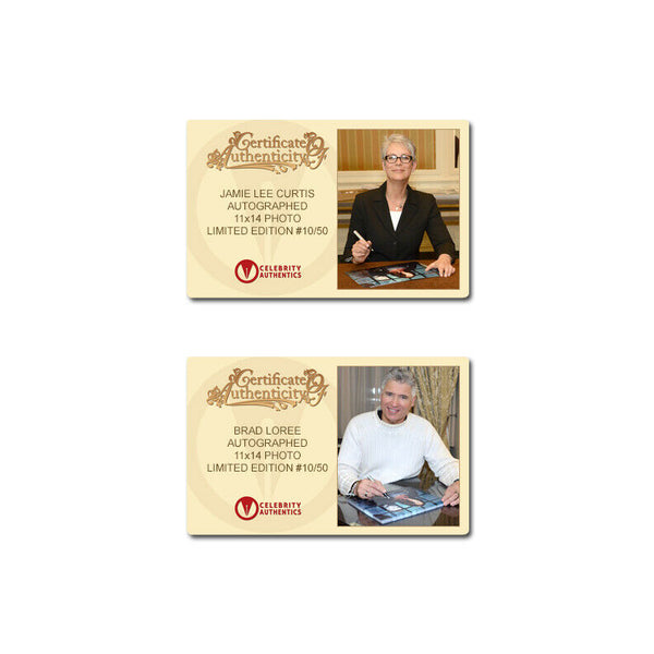 This impressive 11x14 Halloween Resurrection Photo has been personally hand-signed by Jamie Lee Curtis (Laurie Strode) and Brad Loree (Michael Myers) during their signings with Celebrity Authentics. This photo is part of a Limited Edition of only 50. Three years after he last terrorized his sister, Michael Myers confronts her again, before traveling to Haddonfield to deal with the cast and crew of a reality show which is being broadcast from his old home. Item ships affixed with the Celebrity Authentics serial-numbered and tamper evident Authentication Hologram and includes Celebrity Authentics Certificates of Authenticity featuring a picture of Jamie Lee and Brad signing photo. Please note: with multiples signed by the actor, a sample photo is used from stock to represent what you will receive. Exact autograph size and placement may vary.
