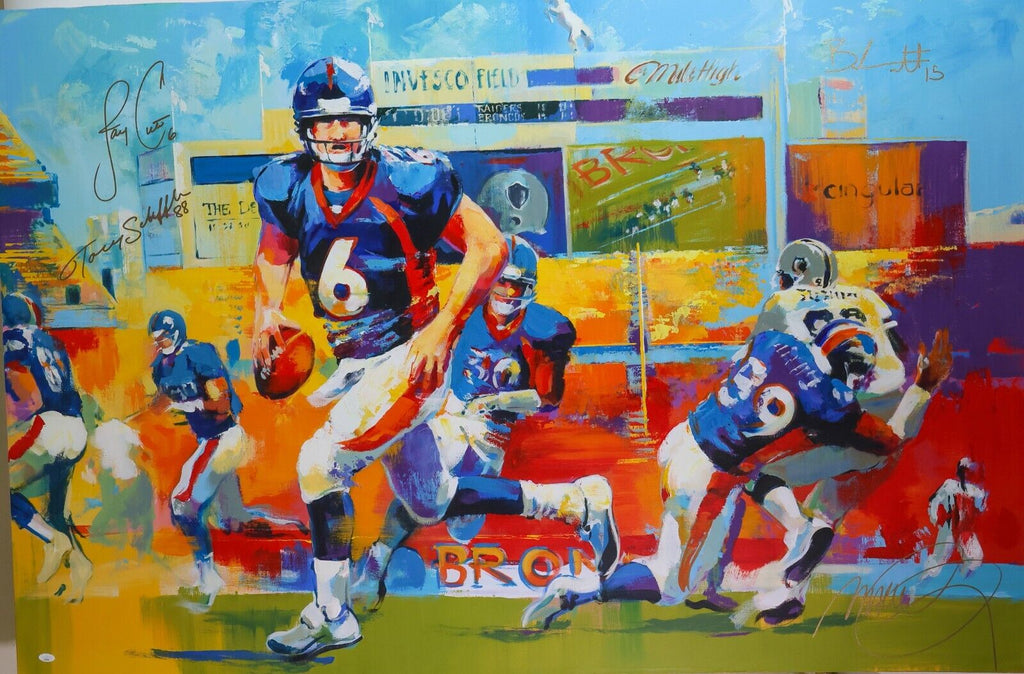 Own a piece of football history with our exclusive autographed original art piece featuring Jay Cutler, Brandon Marshall, and Tony Scheffler, brought to life by the renowned artist Malcolm Farley. This stunning artwork captures the energy and camaraderie of these iconic players, making it a prized addition to any sports memorabilia collection.Each autograph is a testament to the talent and achievements of these celebrated athletes, adding a personal touch to this unique art piece. Jay Cutler, Brandon Marshall, and Tony Scheffler's signatures elevate this artwork from a visual masterpiece to a cherished collector's item.Created by the acclaimed artist Malcolm Farley, this original art piece is a true work of art, combining vibrant colors, dynamic brushstrokes, and meticulous attention to detail. Farley's distinctive style brings the spirit of the game to life, making this artwork a captivating focal point for any room.Whether displayed in your home, office, or fan cave, this autographed original art piece is sure to impress. It's a conversation starter, a statement piece, and a tribute to the enduring legacy of these three football legends.Each piece comes with a certificate of authenticity, ensuring its genuine nature and value as a collectible item. Don't miss your chance to own this one-of-a-kind artwork celebrating Jay Cutler, Brandon Marshall, and Tony Scheffler, created by the acclaimed artist Malcolm Farley.Add this autographed original art piece to your collection today and elevate your love for football to new heights.Frame Size: 60X40...JSA COA
