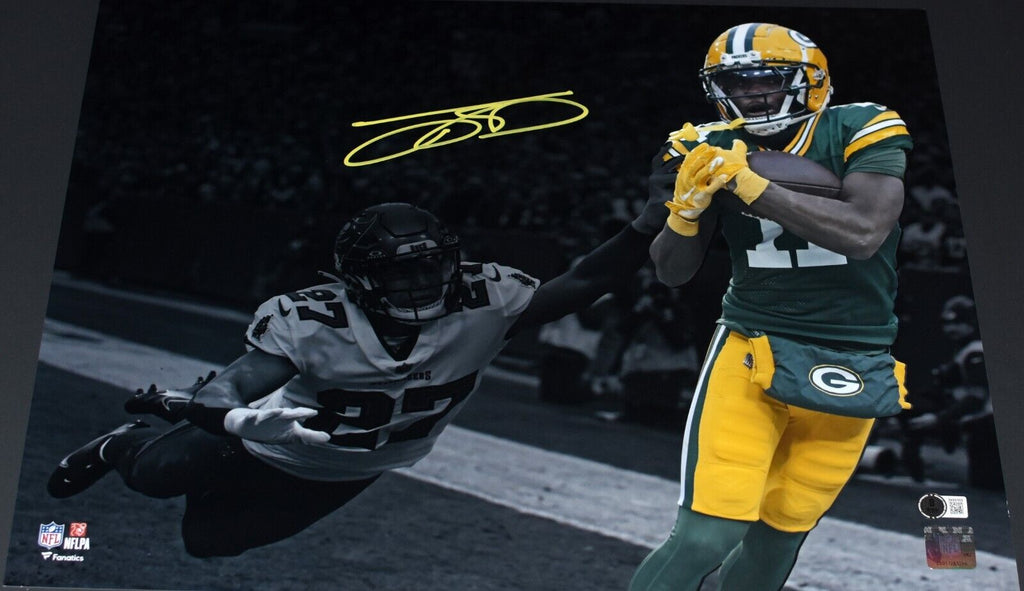 Jayden Reed, star wide receiver for the Green Bay Packers, has hand signed this 16x20 photo at a private signing. This item is authenticated by Beckett Authentication Services and was signed in the presence of one of their representatives. Their tamper-evident hologram featuring a QR code and serial number is on the item. The authenticity can be verified online by entering the serial number or scanning the QR code.Item pictured may not be the exact item you will receive. It will be similar quality, and we guarantee your satisfaction.