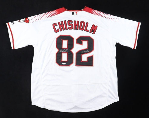 Majestic jersey. Everything is sewn on, size XL. Has been hand-signed and inscribed by Jazz Chisholm Jr.. Please note, there are minor stains near the reverse number.The autograph(s) includes an official James Spence Authentication (JSA) hologram and matching COA for authenticity purposes.Authentication: JSA COA