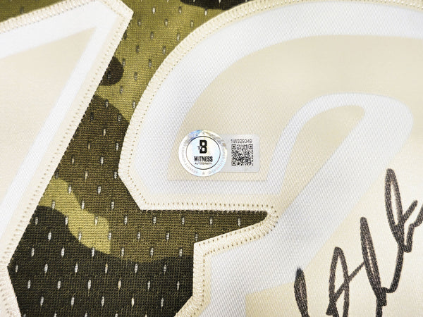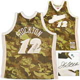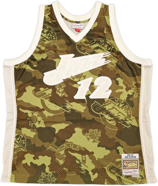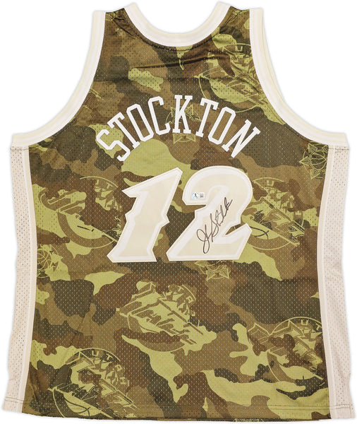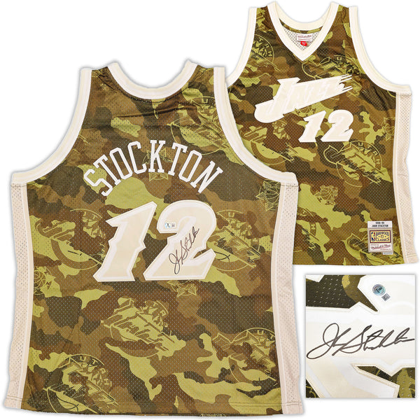 This is a Green Authentic Mitchell & Ness Utah Jazz 1998-99 Hardwood Classic Swingman Ghost Camo Jersey that has been hand signed by John Stockton. This jersey is Size XXL. This item has been witnessed and certified authentic by Beckett Authentication (BAS) and comes with their tamper-proof witness sticker.