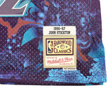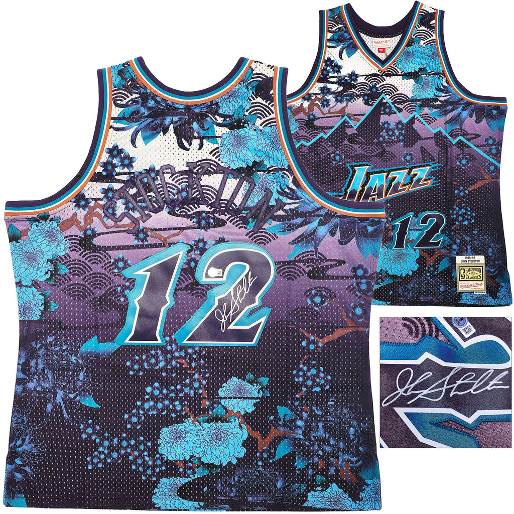 This is a Purple Authentic Mitchell & Ness Utah Jazz 1996-97 Hardwood Classic Swingman Asian Heritage 5.0 Jersey that has been hand signed by John Stockton. This jersey is Size XXL. This item has been witnessed and certified authentic by Beckett Authentication (BAS) and comes with their tamper-proof witness sticker.