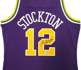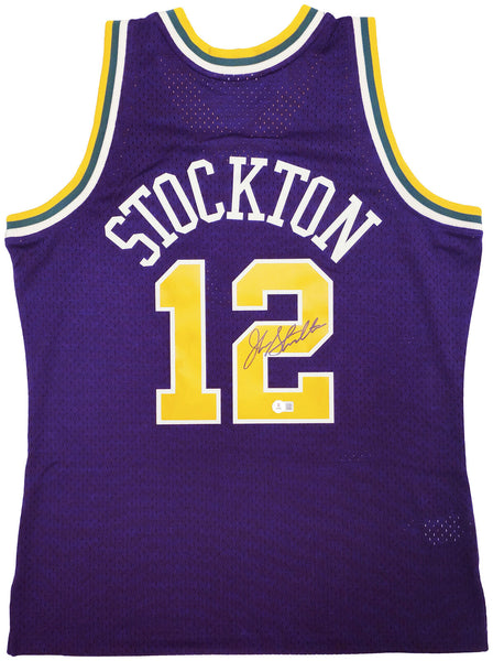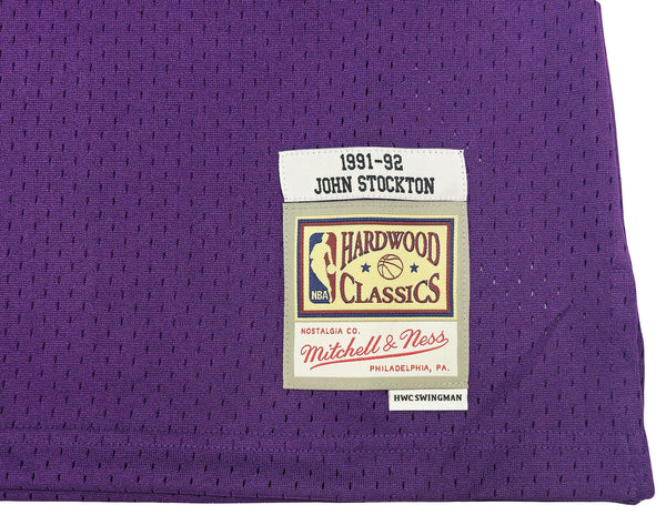 This is a Purple Authentic Mitchell & Ness Utah Jazz 1991-92 Hardwood Classic Swingman Jersey that has been hand signed by John Stockton. This jersey is Size L. This item has been witnessed and certified authentic by Beckett Authentication (BAS) and comes with their tamper-proof witness sticker.