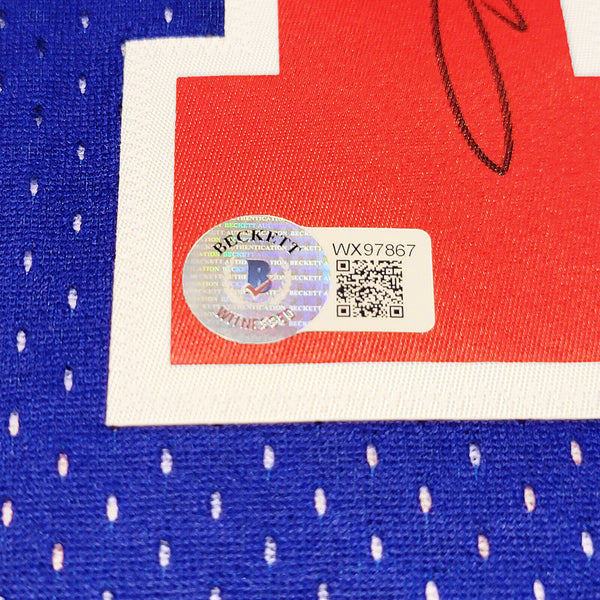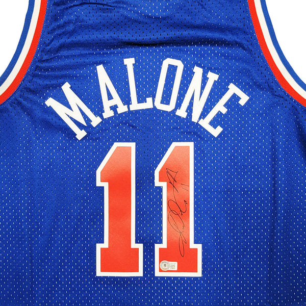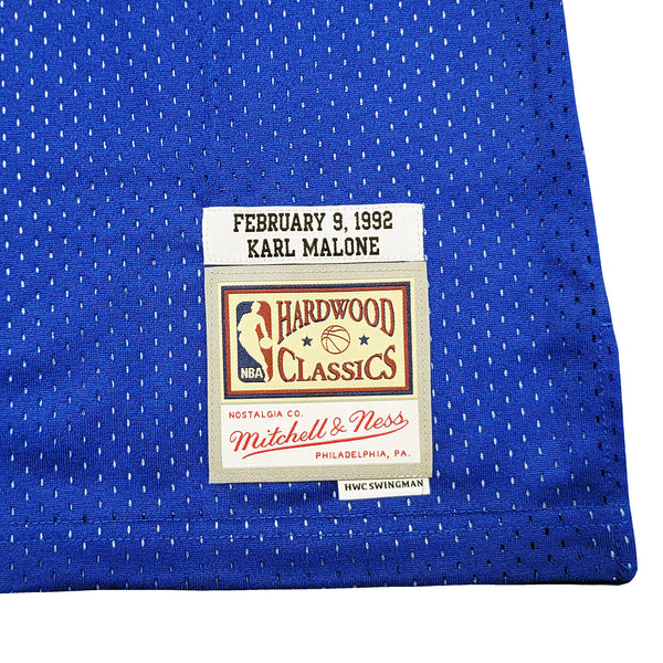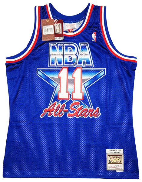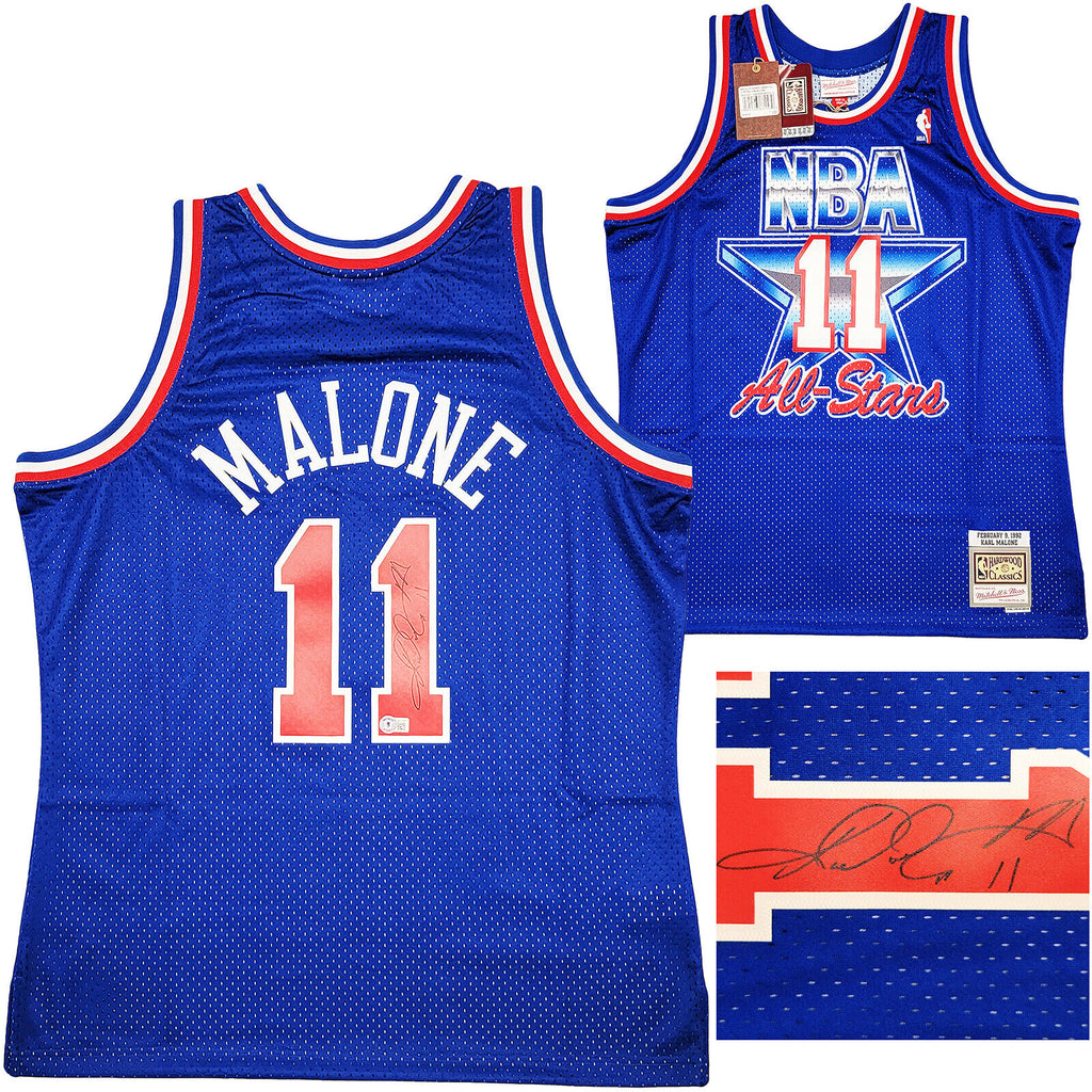 This is a A Blue Authentic Mitchell & Ness Hardwood Classics 1992 All Star Game Jersey that has been hand signed by Karl Malone. This jersey is Size XL. This item has been witnessed and certified authentic by Beckett Authentication (BAS) and comes with their tamper-proof witness sticker. Beckett Authentication has recently changed their physical certificate card policy where they no longer match their tamper-proof sticker with a physical certificate. A certificate can be printed on Beckett's website for the matching authentication number.