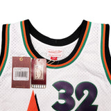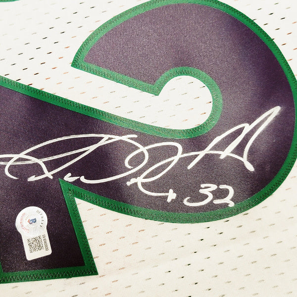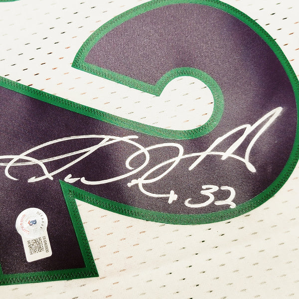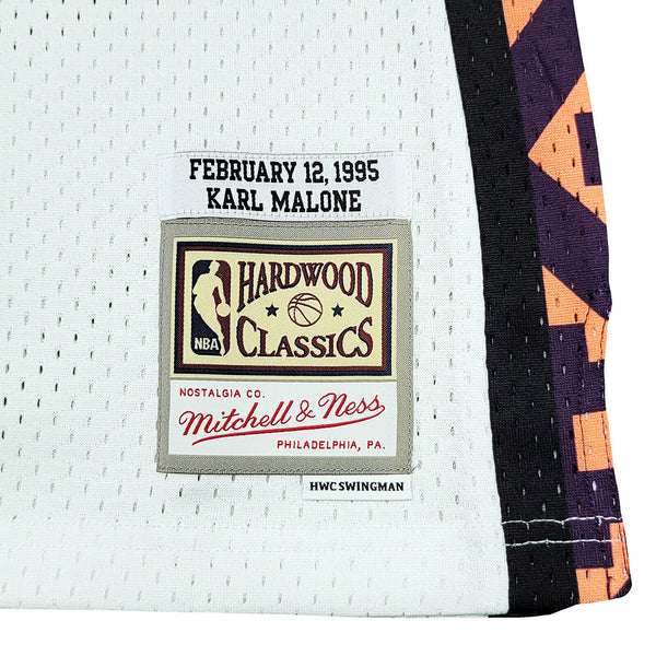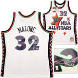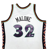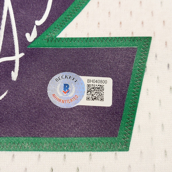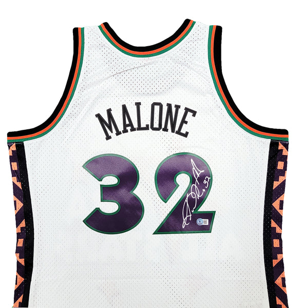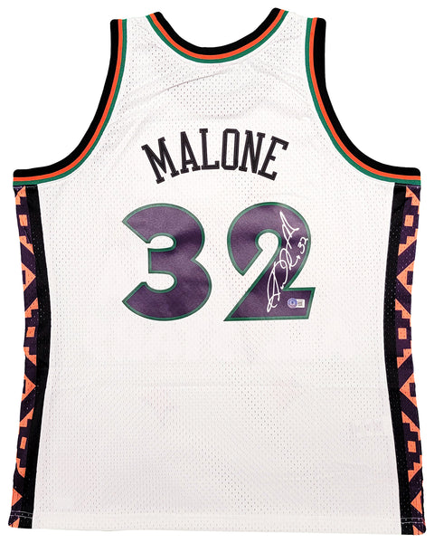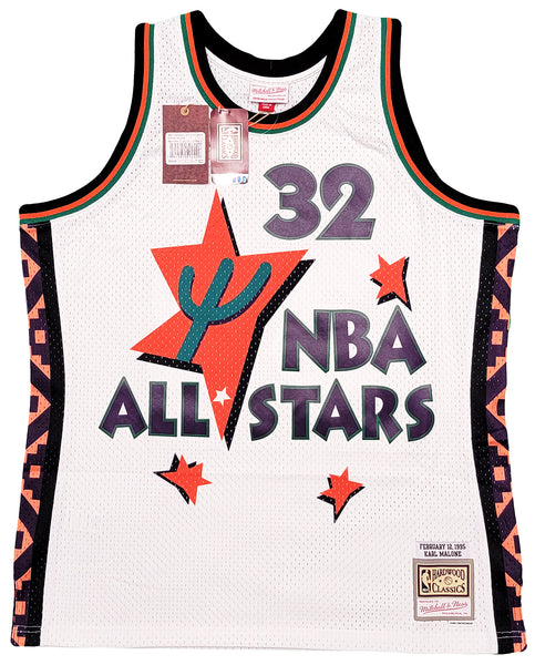 This is a White & Purple Authentic Mitchell & Ness Hardwood Classics 1995 All Star Game Jersey that has been hand signed by Karl Malone. This jersey is Size XL. This item has been certified authentic by Beckett Authentication (BAS) and comes with their tamper-proof sticker. Beckett Authentication has recently changed their physical certificate card policy where they no longer match their tamper-proof sticker with a physical certificate. If the item features a Beckett Authenticated QR Code, the item does NOT come with a matching certificate. A certificate can be printed on Beckett's website for the matching authentication number.