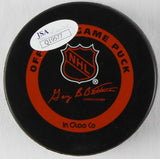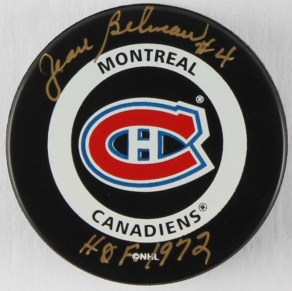 Montreal Canadiens logo hockey puck. Hand-signed in gold paint pen by Jean Beliveau (D.2014, Canadiens, HOF).The autograph includes an official James Spence Authentication (JSA) hologram and matching COA for authenticity purposes.Authentication: JSA COA