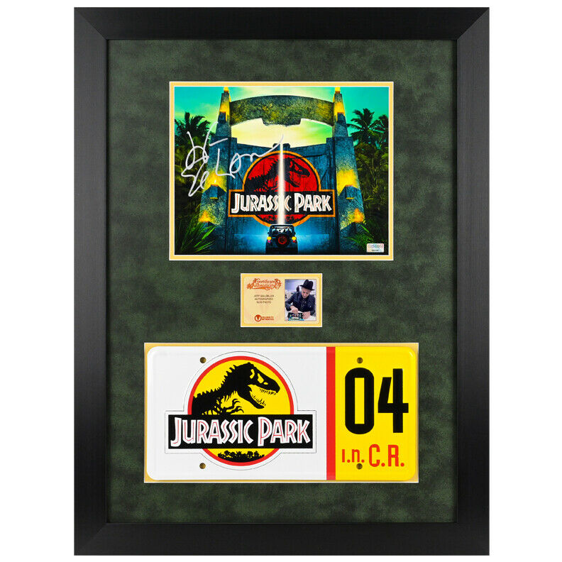 From the Framing Studios of Celebrity Authentics is this License Plate like the one on the iconic Jeep Wrangler from Jurassic Park and this accompanying 8"x10" photo (approximately 18"x14" finished) personally hand-signed by Dr. Ian Malcolm himself, Jeff Goldblum during his signing with Celebrity Authentics. Ships affixed with the Celebrity Authentics serial-numbered and tamper evident Authentication Hologram and includes Celebrity Authentics Certificate of Authenticity featuring picture of Jeff signing photo. Stock image used for product images. Item ships with clean, unsmudged autograph in similar location. Photo is meticulously dry mounted and framed using acid free backing and mat boards with white core for the finest in presentation. UV protective glass with precision cut moulding are used for smooth, clean frame edges, hand assembled in our studio. Additionally, a protective back cover is used to seal the piece with corner bumpers applied to protect your walls, providing adequate air flow. A hanger is affixed to complete the finished collectible. Each framed photo is carefully wrapped for shipping with double protective corners and cushioning to help ensure the item's safe arrival. Celebrity Authentics Framing Studios - acclaimed as the industry's finest! Please note: with multiples signed by the actor, a sample photo is used from stock to represent what you will receive. Exact autograph size and placement may vary.