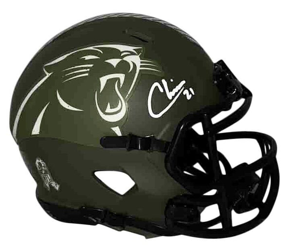 Jeremy Chinn, star safety for the Carolina Panthers, has hand signed this Panthers Riddell Speed Salute to Service mini helmet at a private signing. This item is authenticated by Beckett Authentication Services and was signed in the presence of one of their representatives. Their tamper-evident hologram featuring a QR code and serial number is on the item. The authenticity can be verified online by entering the serial number or scanning the QR code.Item pictured may not be the exact item you will receive. It will be similar quality, and we guarantee your satisfaction.