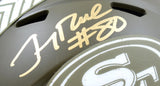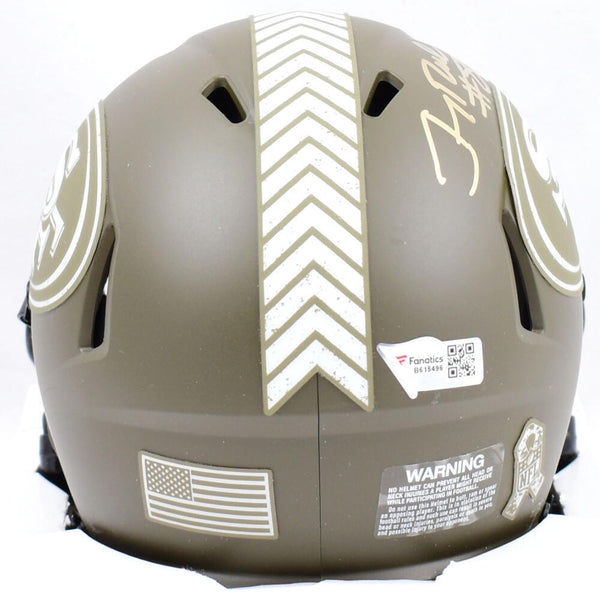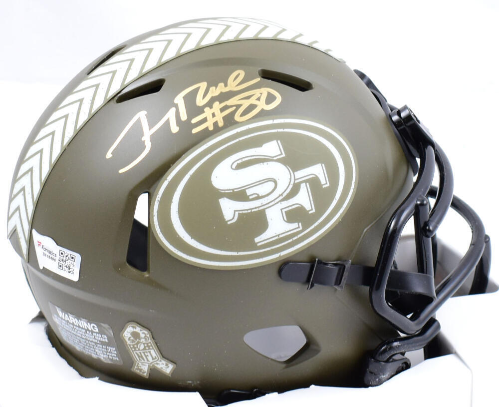 Jerry Rice Autographed 49ers Salute to Service Speed Mini Helmet- Fanatics *Gold This is a hand autograph of Jerry Rice of the San Francisco 49ers on a Riddell Football Salute to Service Speed Mini Helmet. This item has a Fanatics Authentication, which comes with a numbered sticker hologram and a QR code for verification. You can view this item on the Fanatics Authentication website and it shows when and where the item was signed. It was signed either at a public autograph appearance or a private signing. This is a stock photo of the item. Although you may not receive this exact item, the item you receive is virtually identical and brand new in great shape.