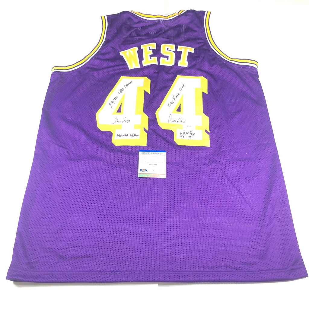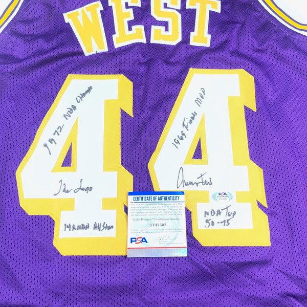 Stitched jersey autographed and inscribed "THE LOGO" by Los Angeles Lakers legend Jerry West. The autograph of Jerry on this jersey was authenticated by a team of experts at PSA/DNA so you can rest assured you are purchasing the real deal.