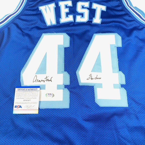 Stitched jersey autographed and inscribed "THE LOGO" by Los Angeles Lakers legend Jerry West. The autograph of Jerry on this jersey was authenticated by a team of experts at PSA/DNA so you can rest assured you are purchasing the real deal.