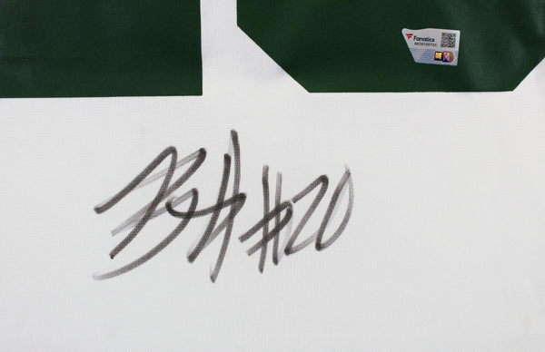 This Autographed White Nike Game Jersey has been Personally Signed by Breece Hall of the New York Jets. This item is 100% Authentic to includes a numbered hologram by Fanatics. We conducted an autograph signing with Breece Hall where multiples of the same item were signed. While the photographs are representative of this item, the size, placement and strength of the signature may vary. Each item is hand signed, therefore, each autograph is unique. This item can be verified through Fanatics. This is a X-Large sized Jersey.