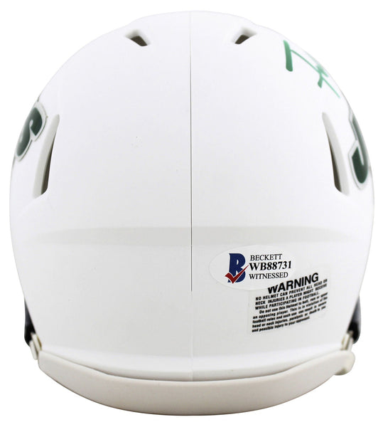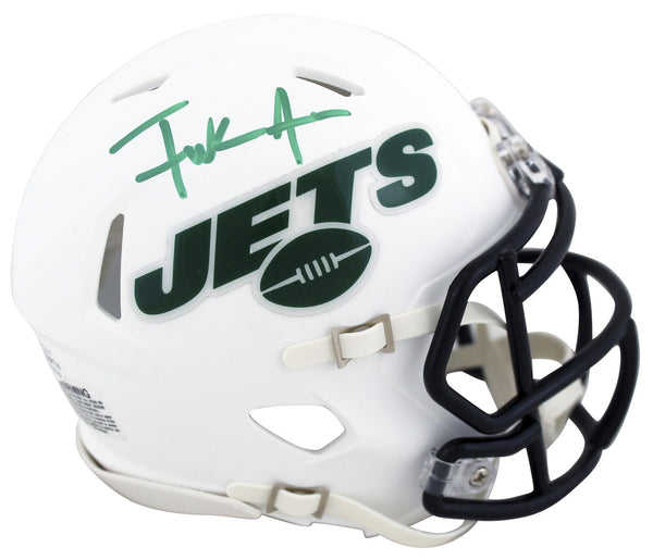 This Autographed Alternate Flat White Speed Mini Helmet has been Personally Signed by Frank Gore of the New York Jets. This item is 100% Authentic to include a Certificate of Authenticity (COA) / hologram by Beckett Authentication Services. This is a BAS Witnessed Protection Program item which means a Beckett Authentication Service representative was present when this item was being signed. The authenticity can be verified on Beckett Authentication Services website.