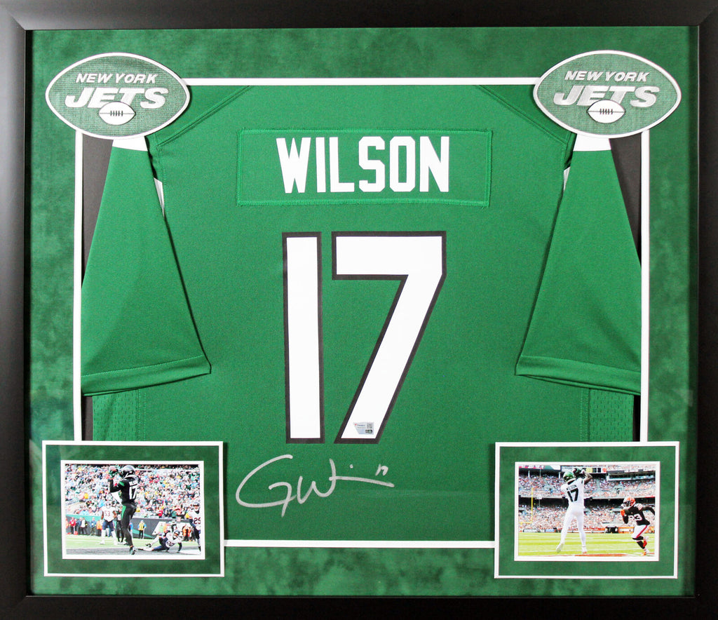 This Autographed Green Nike Game Framed Jersey has been Personally Signed by Garrett Wilson of the New York Jets. This item is 100% Authentic to includes a numbered hologram by Fanatics. We conducted an autograph signing with Garrett Wilson where multiples of the same item were signed. While the photographs are representative of this item, the size, placement and strength of the signature may vary. Each item is hand signed, therefore, each autograph is unique. This item can be verified through Fanatics. This item has been professionally framed to overall dimensions of approximately 32 x 37 inches. This is a X-Large sized Framed Jersey. This jersey will be framed to order, it will take 3-4 days from purchase date for it to ship.