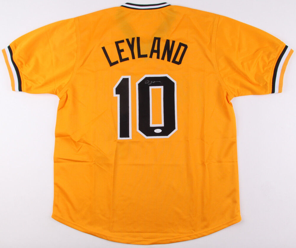 Custom on-field style jersey. Everything is sewn on, size XL. Hand-signed in silver paint pen by Jim Leyland. The lot / autograph(s) includes an official James Spence Authentication (JSA) hologram and matching COA for authenticity purposes. The signing of this item was witnessed by JSA.Authentication: JSA COA
