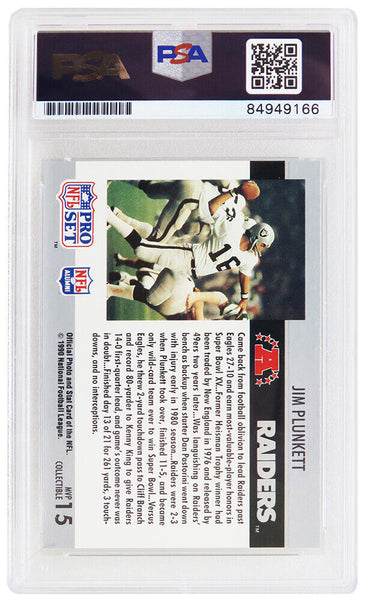 Jim Plunkett signed Raiders 1990 Pro Set Super Bowl XV MVP football trading card #15. The card has been authenticated and encapsulated by PSA/DNA and the number can be verified online. The image of the item is a stock photo, as we may have multiples of the item in stock. The Slabbed Card you will receive will be of the card described. (Same grade, Same authentication) You may or may not receive the exact PSA serial number on the slab label shown in image.
