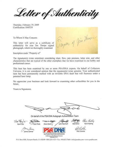 This Autographed 8x10 Photo with the inscription of "Property Of" has been Personally Signed by Jim Thorpe. This item is 100% Authentic and comes with a PSA/DNA Certification Card and a matching numbered Hologram. The authenticity can be verified on Professional Sports Authenticator website.