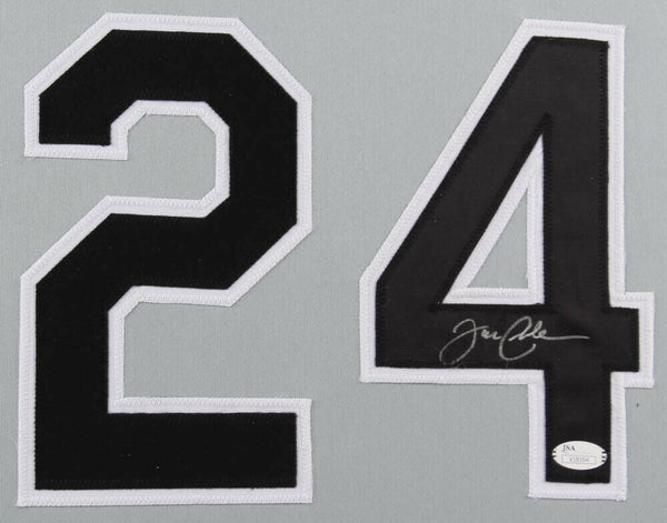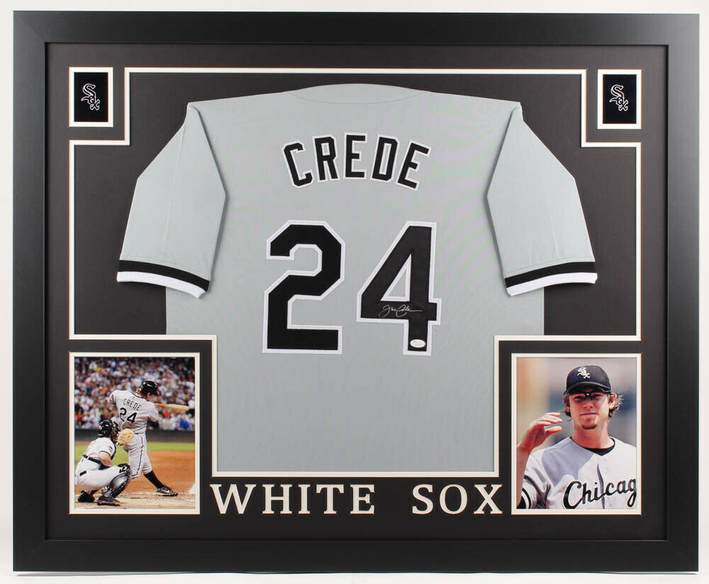 Custom framed display measures approximately 35" x 43" in size and features a jersey which has been hand-signed in silver paint pen by Joe Crede. The lot / autograph(s) includes an official James Spence Authentication (JSA) hologram and matching COA for authenticity purposes. Authentication: JSA COA