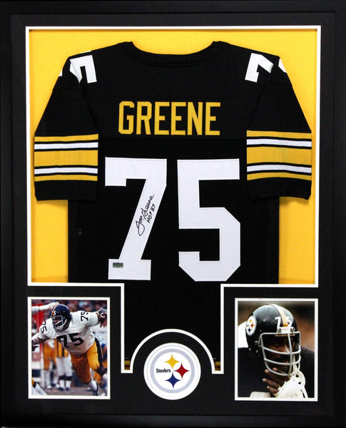 A Pittsburgh Steelers Framed Black Custom Jersey hand signed by "Mean" Joe Greene. The item and signature are in excellent condition. In addition to signing his name, Joe inscribed "HOF 87" on the item. The frame measures approximately 42x34. Joe is a 4x Super Bowl Champion, 10x Pro Bowler, 5x First Team All-Pro and the 1978 Walter Payton NFL Man of the Year award winner. AUTHENTICATION: The item is accompanied by a Certificate of Authenticity, Serial Numbered and Databased Hologram