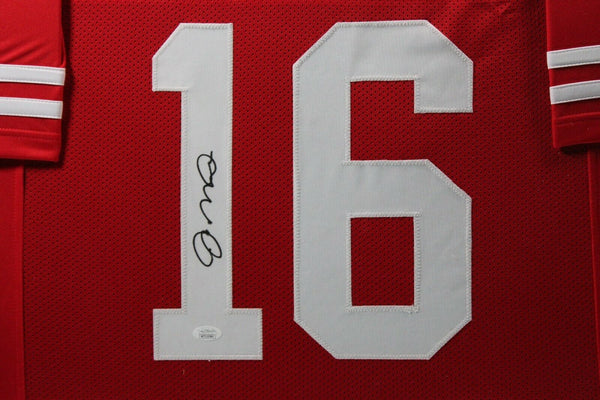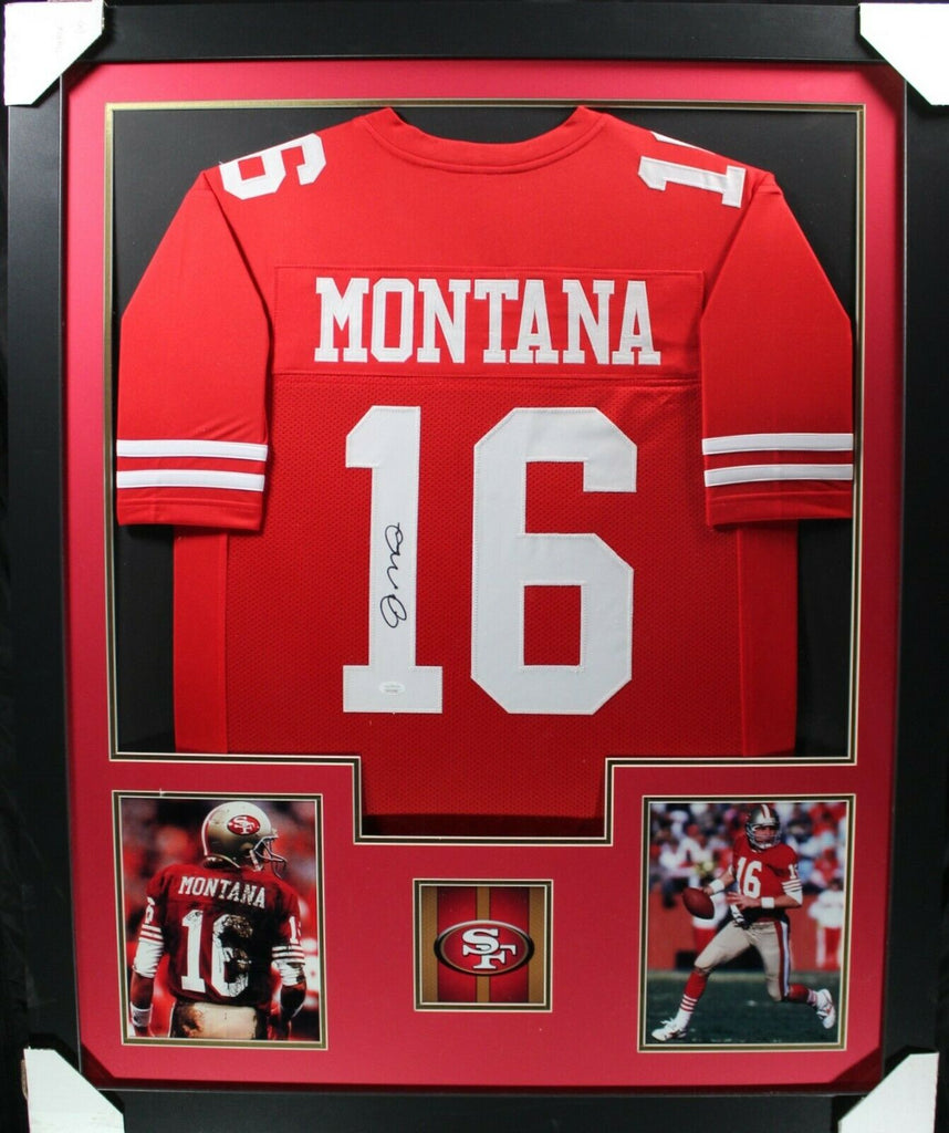 JOE MONTANA AUTOGRAPHED & PROFESSIONALLY FRAMED PRO-STYLE JERSEY(Occasionally our own stock pictures are used at times due to quantity of framing, all frames will look identical as the one pictured)THE FRAMED JERSEY MEASURES 35"x 44" & COMES WITH THE FOLLOWING:-UV Protected Acrylic-Triple Acid Free Team Colored Matting-2 High Quality 8"x10" Photos-Team LogoEvery framed autographed jersey is accompanied with a tamper-proof hologram on the signed part of the jersey from one of the main authenticators in the industry (JSA, Beckett, PSA, etc.) and can be verified on their corresponding websites to prove authenticity.