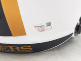 This is a San Francisco 49ers Lunar Eclipse White Full Size Replica Speed Helmet that has been hand signed by Joe Montana. There is an imperfection in the signature as shown. This item has been certified authentic by Fanatics and comes with their tamper-proof hologram.