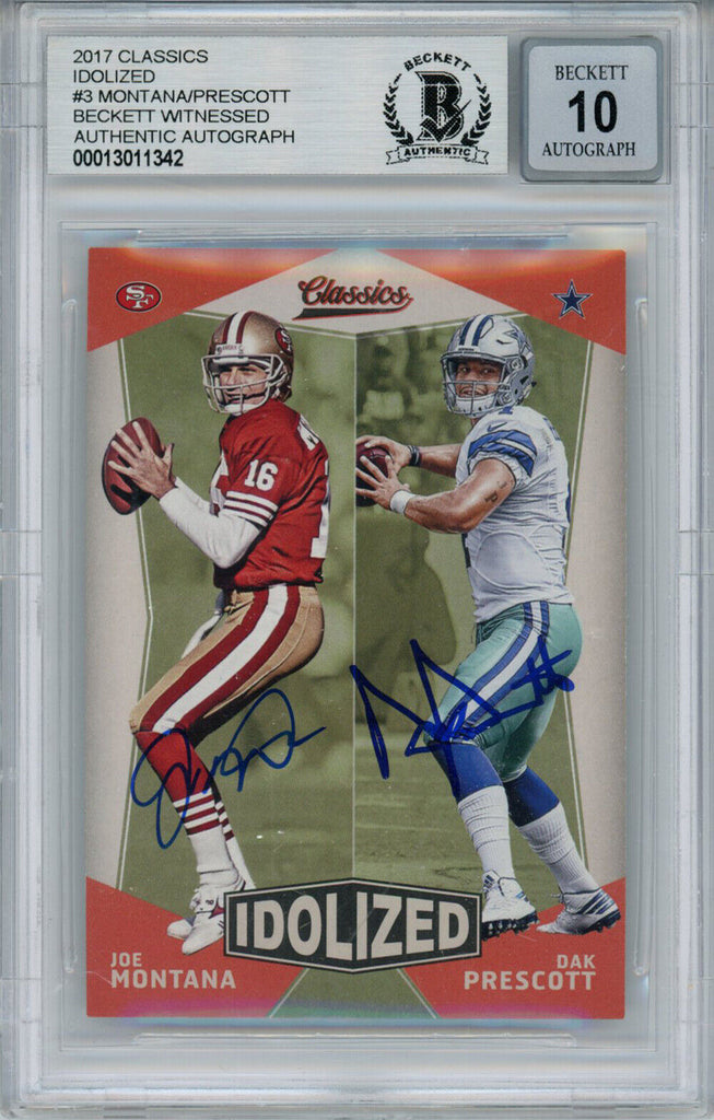 Joe Montana & Dak Prescott 2017 Idolized Classics Trading Card BAS 10 Slab 32779 The number in the listing title is just an inventory sku for our records and is not the authentication number. This is a 2017 Idolized Classics trading card that was personally autographed by both Joe Montana and Dak Prescott. This has been professionally slabbed by Beckett Authentication Services (BAS) and includes a certificate of authenticity from Denver Autographs.
