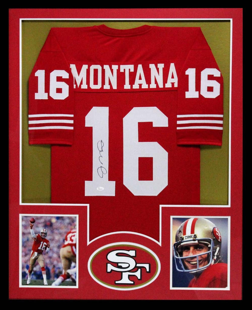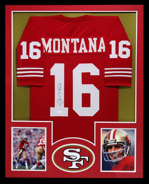 A San Francisco 49ers Red Custom NFL Framed Jersey hand signed by Joe Montana. The item and signature are in excellent condition. The frame measures approximately 42 x 34 and features two 8 x 10 photos of Joe. AUTHENTICATION: This item is accompanied by a JSA Certificate of Authenticity - JSA Serial Numbered and Databased Hologram.