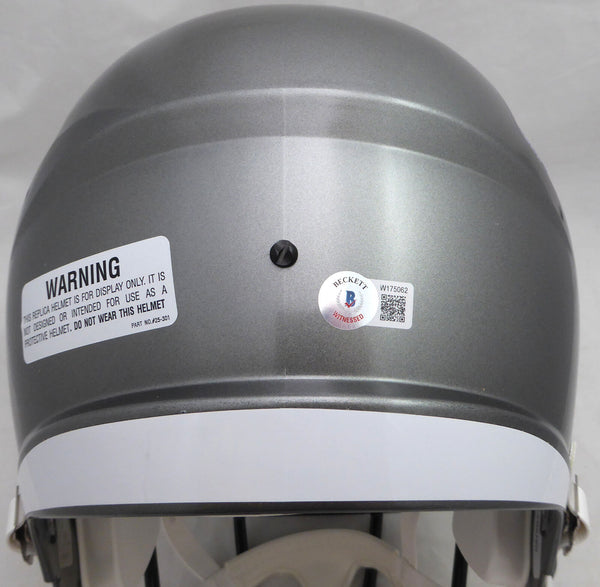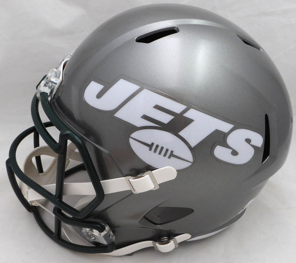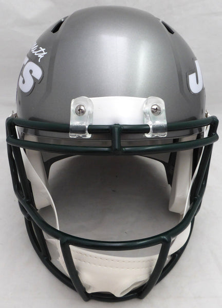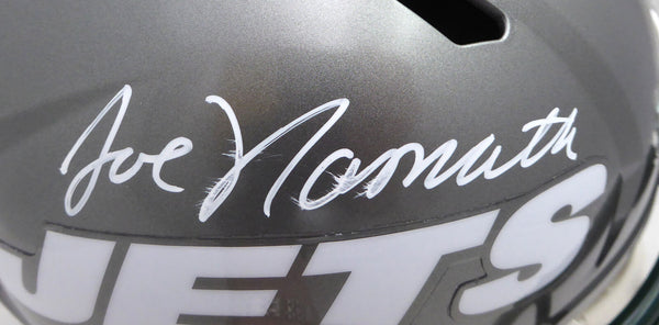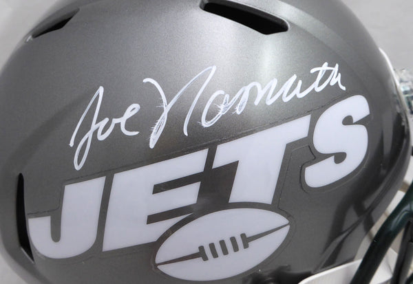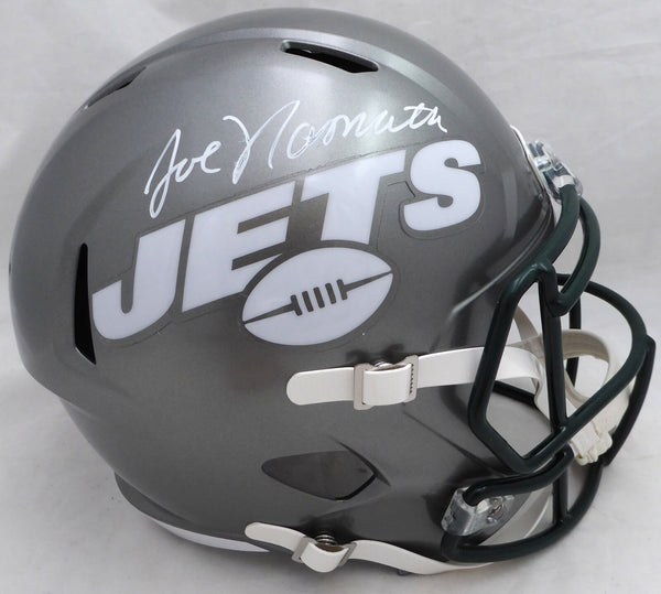 This is a New York Jets Full Size Flash Speed Replica Helmet that has been hand signed by Joe Namath. This item has been certified authentic by Beckett Authentication (BAS) and comes with their tamper-proof QR Code sticker that can be verified on the Beckett-authentication.com.A NOTE: There is a smudge in the autograph, as shown in the pictures.