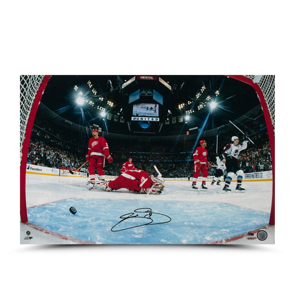 Possessing one of the most feared wrist shots in NHL history, Joe Sakic was a menace with the puck at the end of his stick. He shot found the back of the net 625 times, which puts him 15th on the all-time list. When he captained the Colorado Avalanche — the only NHL organization he ever played for — against the Detroit Red Wings, it was a rivalry for the ages throughout the 1990s and early 2000s. Even though the rivalry began when the Avalanche were in Quebec, it heated up during those two decades as the two teams combined to win five Stanley Cups in a seven-year span from '96-'02. Sakic was literally at the center of many of those battles. In 55 career games against the Red Wings, the 20-year veteran scored 19 goals and notched 56 points. Sakic has signed this limited edition (50) 16" x 24" image in black paint pen. His signature is deemed authentic by virtue of Upper Deck Authenticated's Five Step Process.