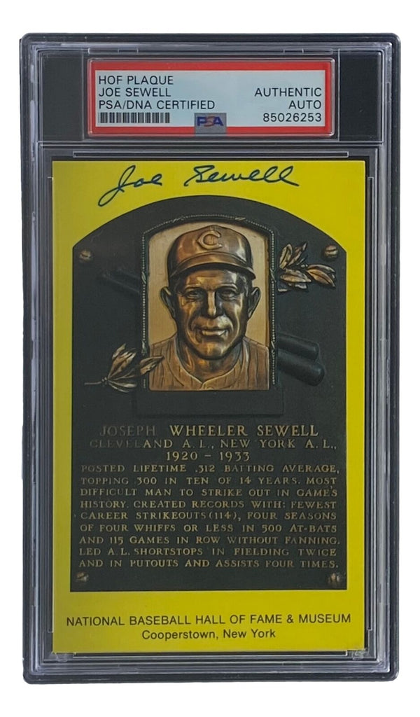 Featured is a Joe Sewell (Cleveland) signed 4x6 Hall Of Fame plaque card. This card has been hand signed by Sewell and has been authenticated and encapsulated by PSA/DNA. This card would make a great addition to any sports memorabilia collection!. SPECIFICATIONS Autographed By: Joe Sewell Team: Cleveland Sport: Baseball Authentication: Professional Sports Authenticator (PSA)