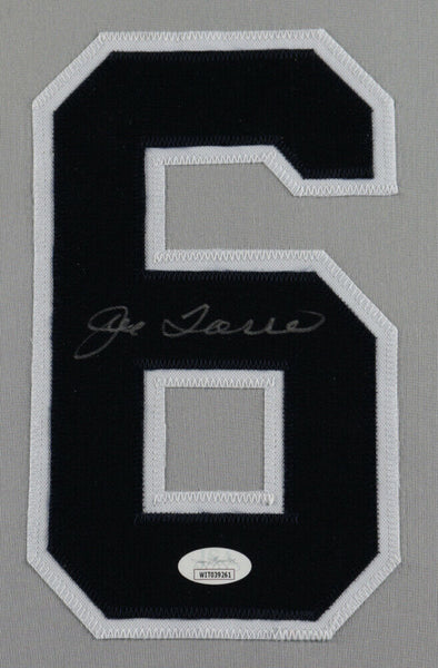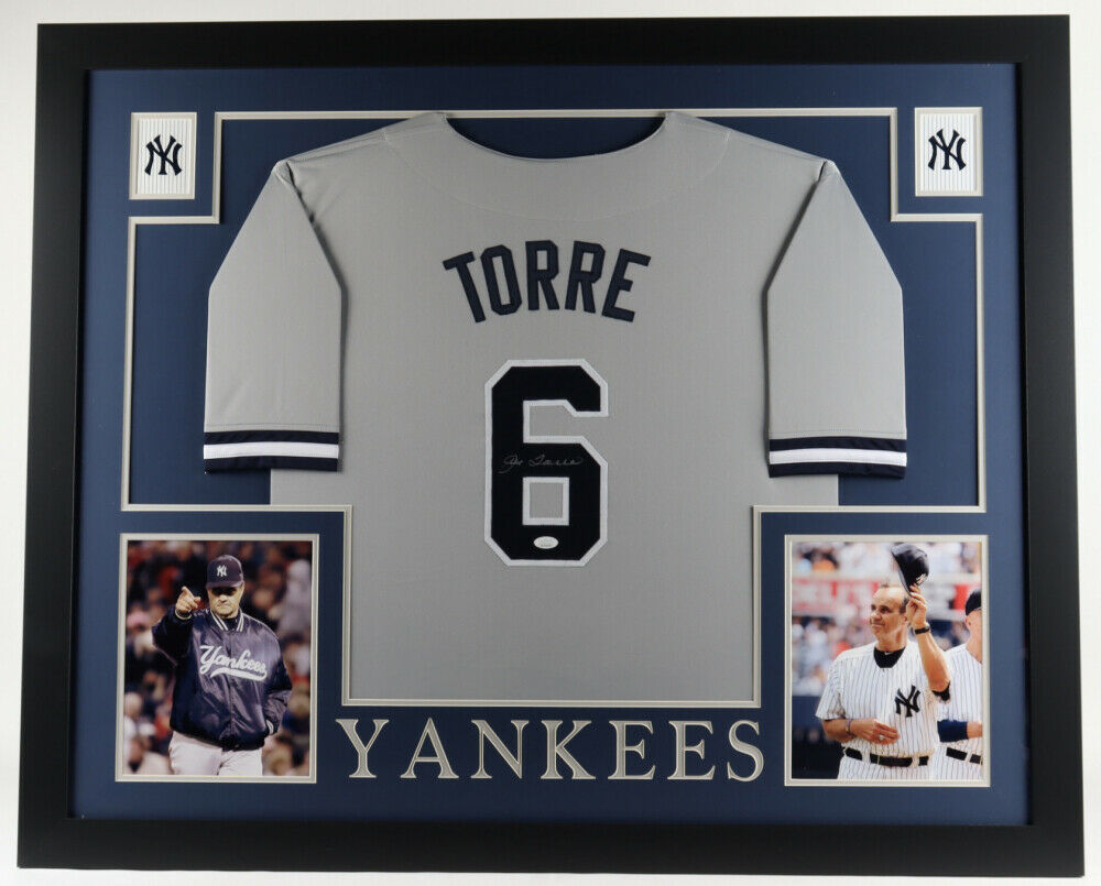 Custom frame measures approximately 35" x 43" in size and features a jersey which has been hand-signed in silver paint pen by Joe Torre. The lot / autograph(s) includes an official James Spence Authentication (JSA) hologram and matching COA for authenticity purposes. Authentication: JSA COA