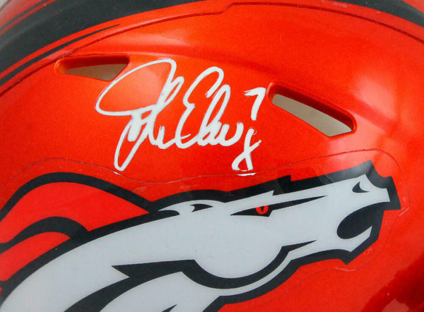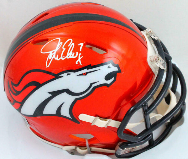 John Elway Autographed Denver Broncos Flash Speed Mini Helmet- Beckett W Hologram *White This is a John Elway of the Denver Broncos hand autographed Riddell Flash Speed Mini Helmet. This item has a Beckett Witnessed Authentication, which comes with a numbered hologram and a generic Beckett Certificate of Authenticity. You can view this item on the Beckett Authentication website and it shows when and where the item was signed. It was signed either at a public autograph appearance or a private signing. This is a stock photo of the item. Although you may not receive this exact item, the item you receive is virtually identical, brand new, and in great shape.