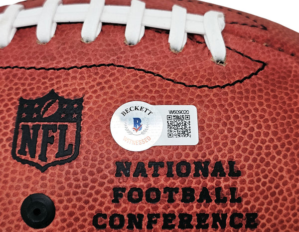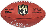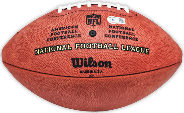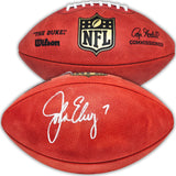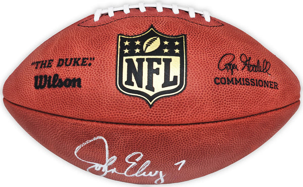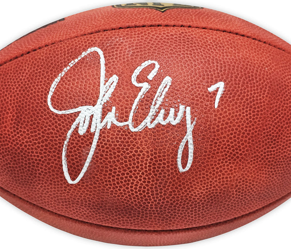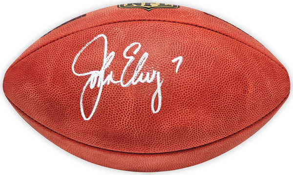This is an Official Leather Gold Shield Football that has been hand signed by John Elway. This item has been witnessed and certified authentic by Beckett Authentication (BAS) and comes with their tamper-proof witness sticker.