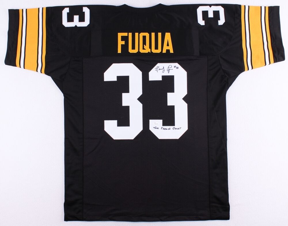 Custom on-field style jersey. Everything is sewn on, size XL. Hand-signed and inscribed in black felt tip pen by John Fuqua.Things looked bleak for the Steelers late in the 1972 AFC Divisional Playoff Game vs. the Oakland Raiders, because backup quarterback Ken Stabler had run 30 yards for a touchdown that gave his team a 7-6 lead with just 1:17 to play. Soon afterward, quarterback Terry Bradshaw and the rest of the Steelers offense were looking at a fourth-and-10 from the 40-yard line with just 22 seconds remaining. and desperately searching for the team's first ever playoff, it didn't look promising. But they never gave up. While under pressure Bradshaw through the ball in the direction of Frenchy Fuqua and as it arrived, he collided with Raider's safety Jack Tatum, and the ball ricocheted back, and Franco Harris miraculously scooped it out of the air and took off running for a 60-yard touchdown reception that gave the Steelers the 13-7 win and a wild celebration ensued. The autograph includes an official James Spence Authentication (JSA) hologram and matching COA for authenticity purposes. The signing of this item was witnessed by JSA.Authentication: JSA COA