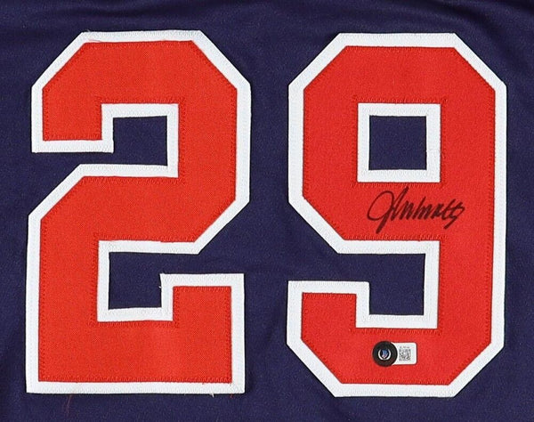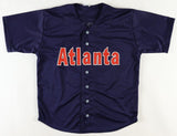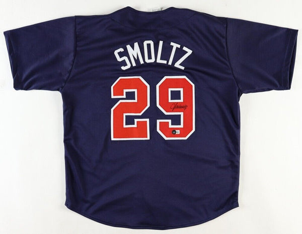 Custom on-field style jersey. Everything sewn on, size XL. Hand-signed in black felt tip pen by John Smoltz (HOF). The autograph includes an official Beckett Authentication Services serially numbered hologram for authenticity purposes.Authentication: Beckett Hologram