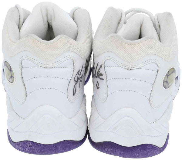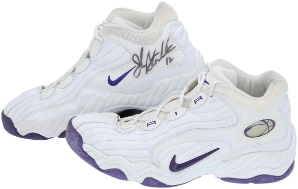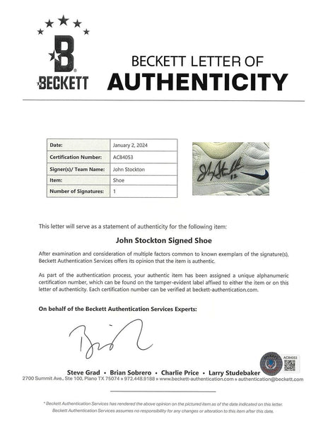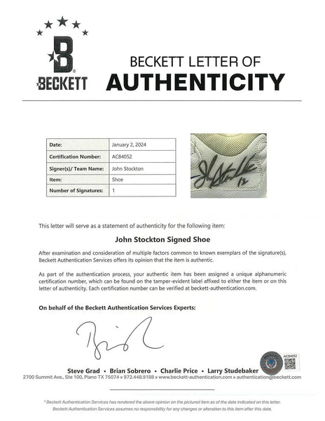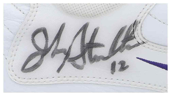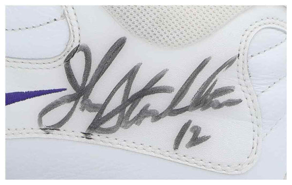 Featured is a John Stockton twice signed, game used pair of Nike sneakers. These sneakers have been game used, and hand signed by Stockton and come with the Beckett hologram and letter of authenticity, along with the Mears letter of authenticity. These shoes are size 12.5. These shoes would make a great addition to any sports memorabilia collection!. SPECIFICATIONS Autographed By: John Stockton Team: Utah Jazz Sport: Basketball Authentication: Beckett Grading Services
