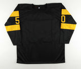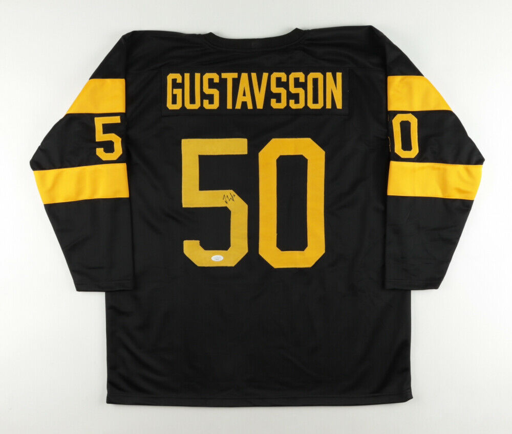 Custom on-ice style jersey. Everything sewn on, size XL. Hand-signed by Jonas Gustavsson.Please note, the rear-side number patches have some light discoloration. See photos to confirm the jersey's condition.The lot / autograph(s) includes an official James Spence Authentication (JSA) hologram and matching COA for authenticity purposes.Authentication: JSA COA